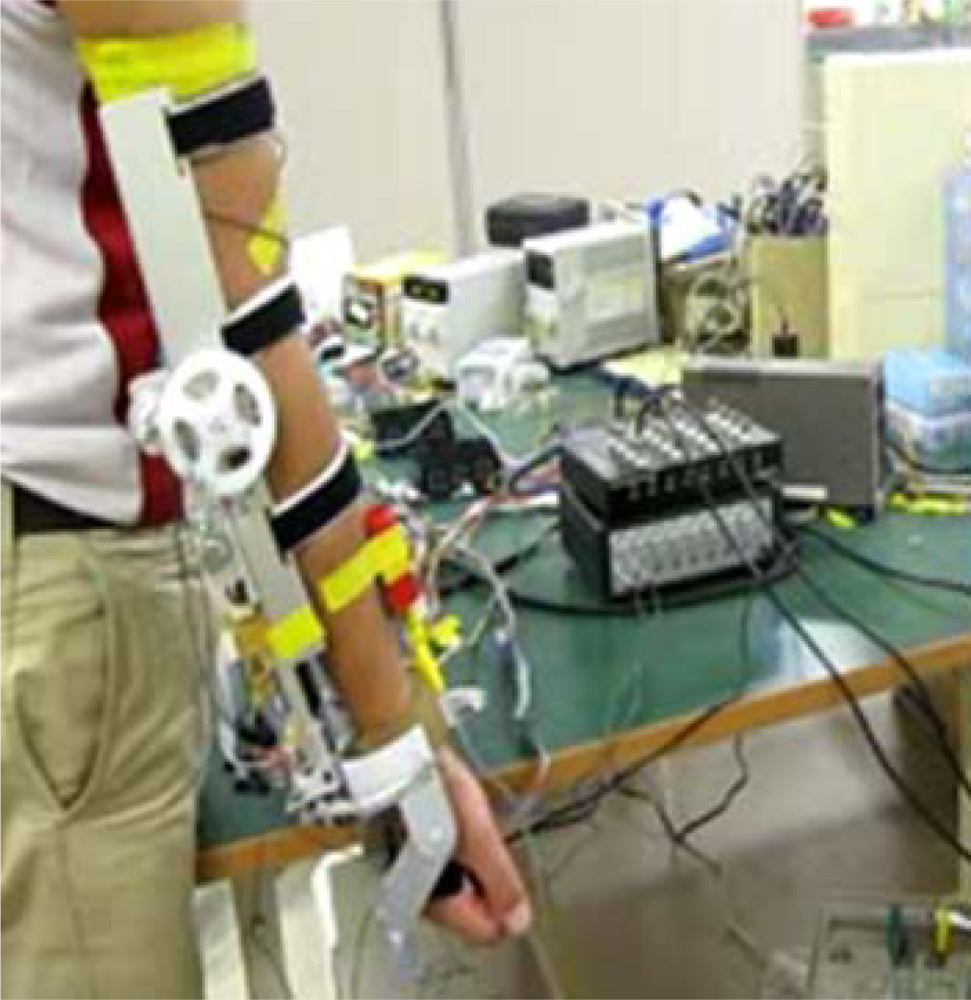 After confirming the control coefficients, the tracking of upper limb movement will be performed in real-time based on the connected experiments. The subject sits on a chair facing the monitor of a computer. The ULERD is fixed onto his right arm with some elastic belts. The inertia sensor is mounted on the upper arm near the wrist joint (Figure 11). The purpose of this experiment is to realize the synchronized motion between upper arm and the device so that the subject can hardly feel the resistance while performing the experiment.