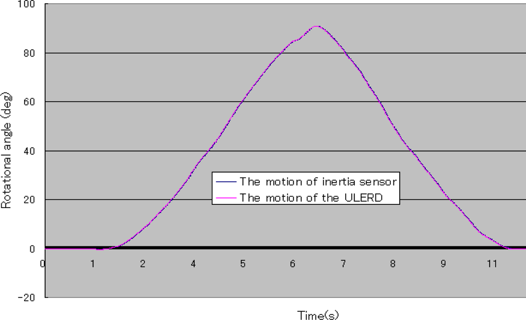 In Figure 12, the blue curve stands for the rotational angle of the subject’s forearm detected by the inertia sensor and the pink curve stands for the rotational angle of the ULERD. Both trajectories are almost superposed, which indicates that the proposed method is effective and the tracking performance is implemented well in real time. Comparing Figure 12 with Figure 8, we can know that the subject’s performance of the rotational forearm motion while wearing the exoskeleton device and the inertia sensor is almost the same as the case of not wearing the exoskeleton device. This indicates that the ULERD can perform compliantly with the motion of subject’s upper limb without constraints. Therefore, this prototype of exoskeleton device has the potential to be used in active rehabilitation.