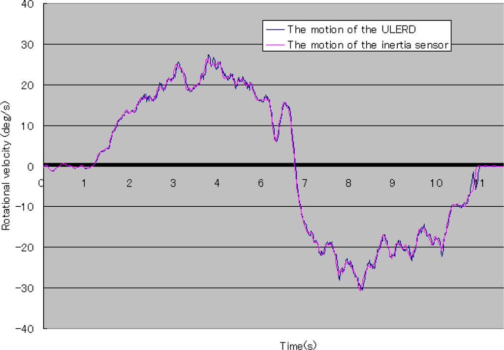In Figure 13, the blue curve stands for the rotational velocity of the ULERD and the pink curve stands for the rotational velocity of the inertia sensor. We can see both trajectories are also the same. This means that the velocity of motion of the user’s forearm is the same as that of the device and the tracking performance can be implemented in real time. It also indicates that the proposed method can implement the human-machine synchronization using the ULERD and the inertia sensor.