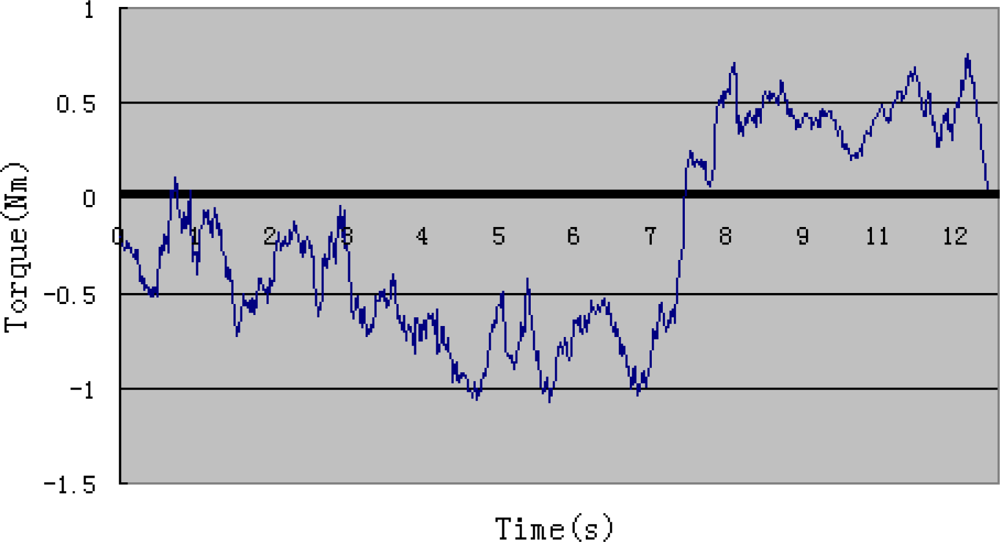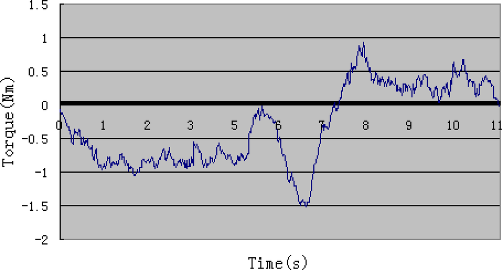 Figure 14 shows the output torque of the motor during the experiment. According to Figure 9, we can learn that the output torque becomes a little higher around the sixth second, which is because the elastic belts prevent skin’s stretching when the forearm is perpendicular to the upper arm. Resistance of the structure influences subject’s performance only in a small range. The surveillance of output torque is important for safety reasons. It is also a reference in active training.