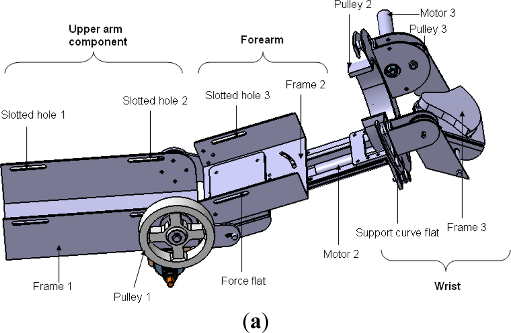 The motivation of the ULERD design is to provide multiple rehabilitation strategies to patients with motor dysfunction to recover the motor functions of the upper limbs, including elbow and wrist joints. The basic design structure of the ULERD from an upper view is depicted in Figure 1. Three active DoFs were designed in the elbow and wrist, including the elbow flexion/extension, forearm pronation/supination and wrist flexion/extension [21]. These three DoFs are both actuated and sensorised. On the other hand, four passive DoFs were added, including two DoFs (one is rotation and the other is translation) in the elbow joint, another two in the wrist joint considering some factors, for example, variation of flexion/extension axis (FEA) [22], personalized otherness in physical dimension of the joint and correlating the misalignment between the device and human limb. Two passive rotational DoFs are sensorised with potentiometers and they can be locked or unlocked according to different cases.