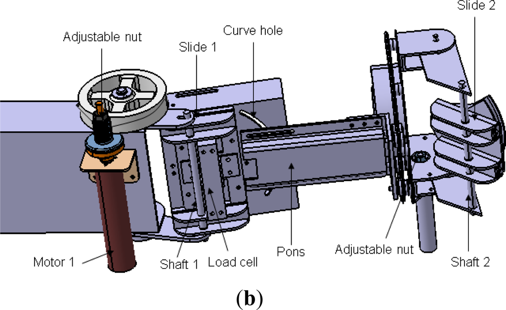In passive rehabilitation mode, the device should be able to exert enough torque; meanwhile, the training is performed slowly, so a gearhead with high ratio can be used. The safety requirements are also very important for a rehabilitation device, so a mechanical mechanism was designed to prevent overload during rehabilitation. The helical capstan shaft is set apart from the motor shaft during overload. In detail, the axle sleeve of the motor is connected to the helical capstan shaft by the friction derived from adjusting an outer thumbnut (Figure 1(b)).