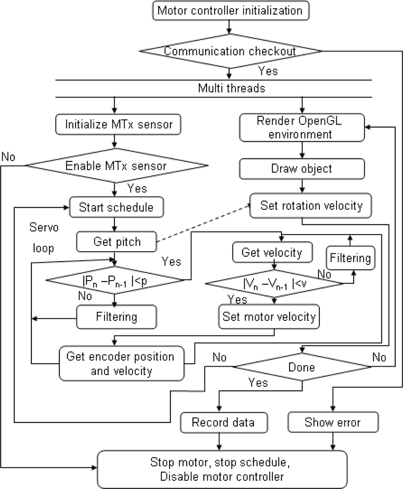 When speaking of neurorehabilitation, visual stimulation and visual feedback are important, therefore, a user interface was created based on OpenGL, which can monitor the status of a user’s limb, including rotational angles and velocity. In order to monitor the motion and the device’s tracking performance in real time, a multi-thread was utilized in the program, in which reading and setting angle or velocity are of the higher priority than rending the OpenGL graph (Figure 3).