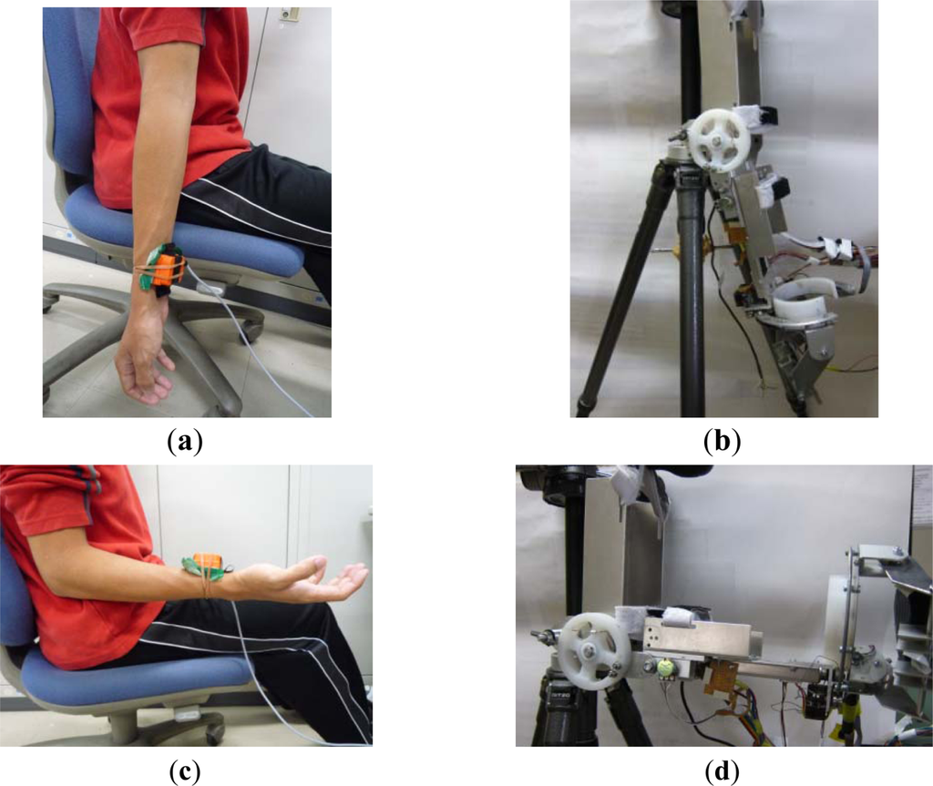 Before performing a real-time motion tracking experiment, the coefficients of the system methodology can be obtained by calibrating the inertia sensor and the ULERD in disconnected experiments. In this phase, the inertia sensor is fixed onto a healthy subject’s upper arm near to his wrist. The subject is required to perform elbow extension/flexion at a slower speed with the upper arm fixed to estimate the training for stroke patients (Figure 7(a,c)). The ULERD is fixed on a tripod with component of upper arm fixed (Figure 7(b,d)). The aim of experiment is to realize the synchronized motion of the ULERD with the subject’s forearm during elbow flexion and extension. The optimized control coefficients can be calculated by input and output of system after many experiments according to Equation (2).