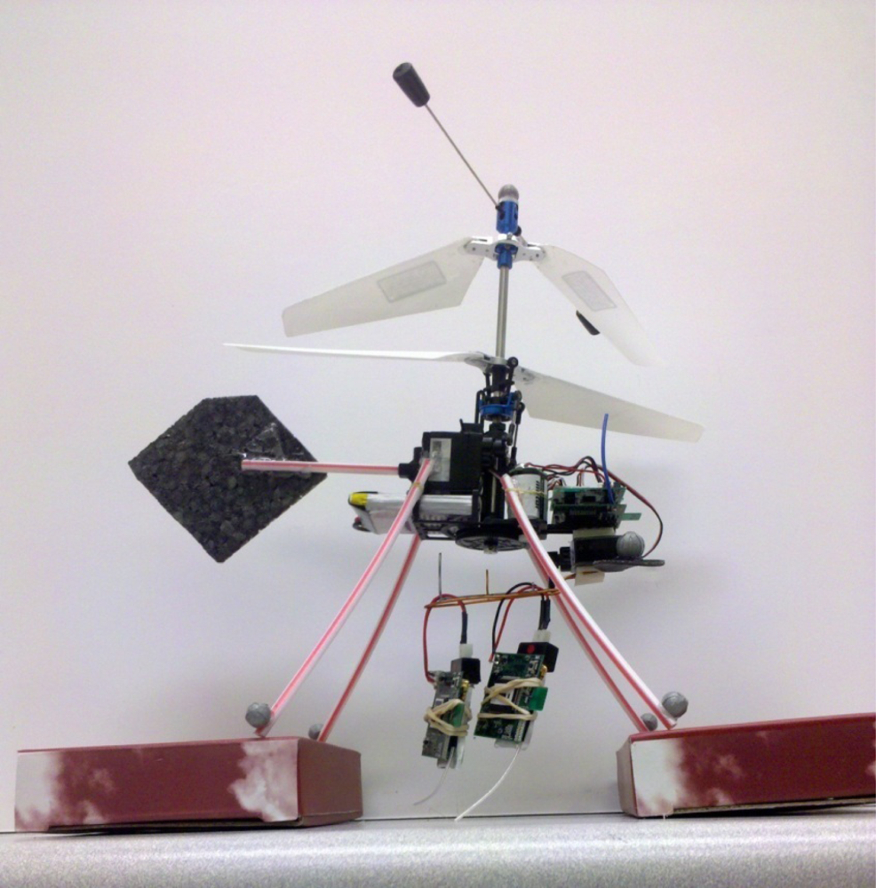 Our MAV platform combines a miniature helicopter with an ultra-low-powered wireless node (Figure 1). The GINA board [14] consists of a 2.4 GHz IEEE 802.15.4 radio, Texas Instruments MSP430 microprocessor, and a number of inertial sensors. The GINA platform can be used directly as a MAV flight controller, or as a relay for control signals from a central location [15]. The OpenWSN project [16] has been ported to the GINA hardware to implement time synchronization, frequency channel hopping, mesh networking, and multihop communications. A MAV controlled by a GINA can be used to deploy additional GINA nodes for the stationary drop-off mesh infrastructure, as shown in Figure 2. With standards compliant networking interfaces, this hardware forms a testbed for the implementation of the protocols described in this paper.