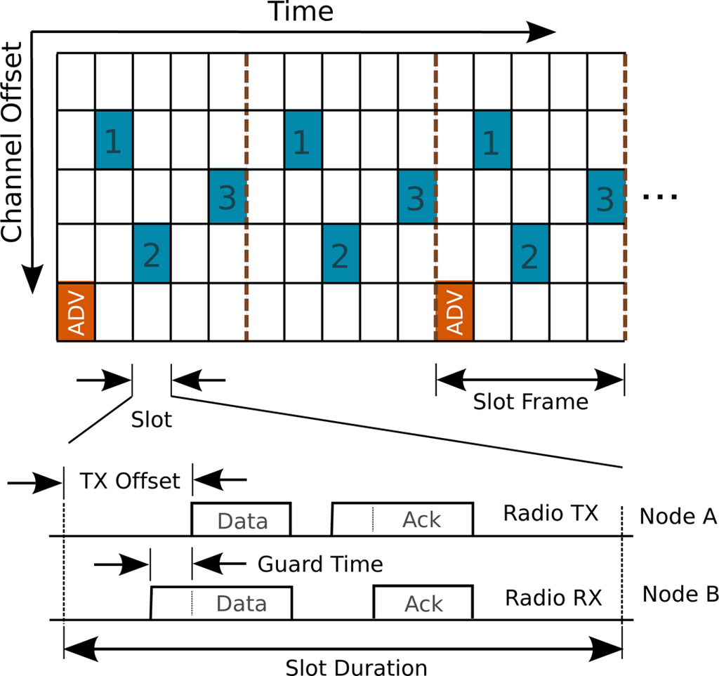 TSMP relies on a number of MAC-layer enhancements (and thus larger implementation overhead) to facilitate synchronization and frequency channel diversity. It is a networking technique that relies on an agreed upon transmission schedule between network nodes (Figure 3). Time is sliced up into time slots of equal length (10ms according to the IEEE 802.15.4e standard); a constant number of slots make up a slot frame which repeats indefinitely over time. Once synchronized, network node pairs are scheduled to exchange communications at a specified time slot and channel offset (carrier frequency, 16 of which are specified by IEEE 802.15.4) within the repeating slot frame. A major requirement stipulates that no two node pairs can communicate during the same time slot and on the channel offset, thus ensuring collision-free communication. It has been shown that multipath fading and external interference can drastically impede network connectivity if a single frequency channel is used [7]. Since nodes only communicate when scheduled, they keep their radios powered off most of the time. This low duty cycle plays a critical role in keeping battery consumption to a minimum, theoretically permitting one of our nodes to last years on a standard AA battery. Such a TDMA-based network can significantly increase the throughput of a WSN, while reducing energy consumption and packet collision rates [13].
