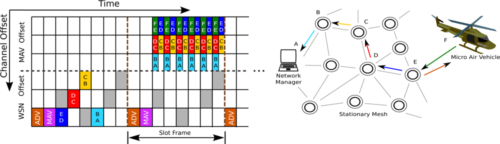 Rather than building a single network architecture that compromises on all these metrics, we propose instead to have a dual-mode network. The deployed stationary network operates by default as a standard TDMA-based mesh. As new nodes are dropped off by the MAV, they join the mesh and carry on as described by TSMP standards. A modification is added to facilitate communications with the MAV; this communication is carried out on an independent set of channels. In an IEEE 802.15.4 network, 16 channels are typically available for transmission. In the proposed architecture, a subset of these channels is reserved for low throughput stationary mesh communications, while the remainder is only used when required by MAV agents.