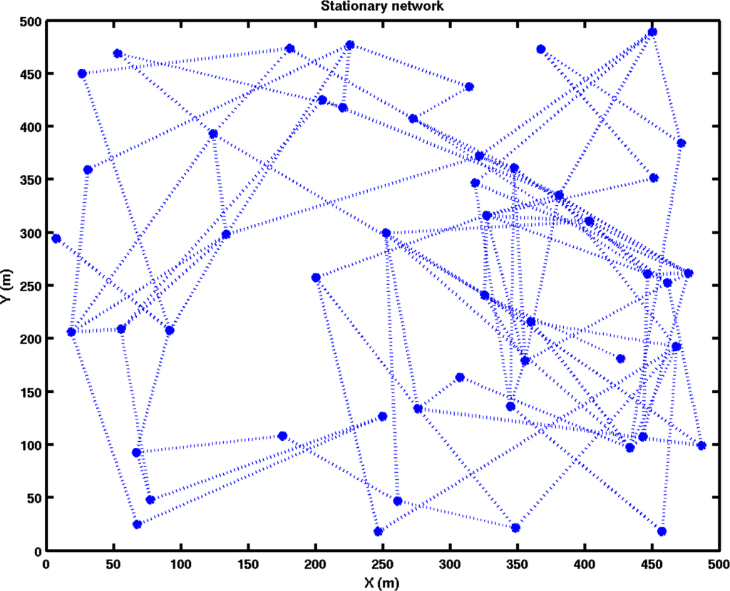 To evaluate the feasibility of extending a TSMP network to communicate with a mobile agent, a sample network was simulated using MATLAB. An area was populated with randomly distributed network nodes at varying densities (see e.g., Figure 7) through which moved the mobile node. Time varying connectivity between nodes was modeled using a stochastic noise penalty atop the Friis equation [28]. This allows for the empirically observable random packet loss despite high average signal strength.