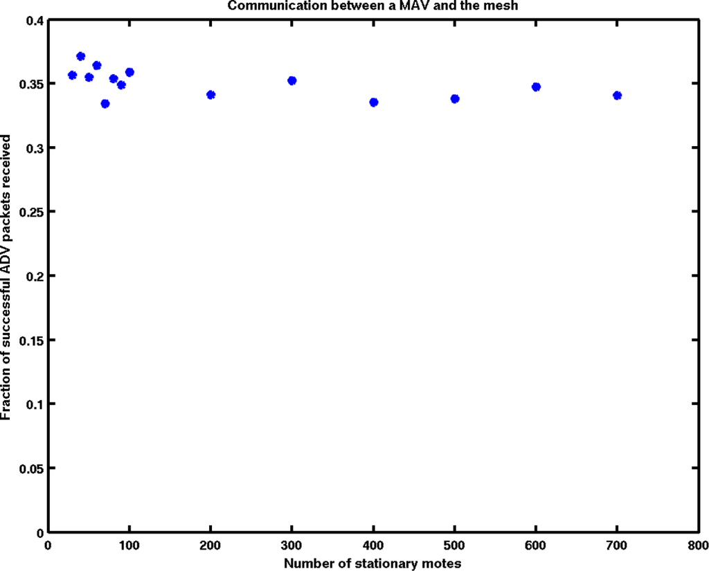 In that case, and accounting for stochastic packet loss, the MAV received a successful ADV ≈ 35% of the time, regardless of density (see Figure 8). In those slot frames, then, data can be offloaded from the MAV into the mesh. Once in the mesh, the data can be transmitted to the base station as governed by the TSMP network parameters [13]. Depending on the desired metric, dropped data packets can be retransmitted to ensure reliability, or ignored to preserve latency.