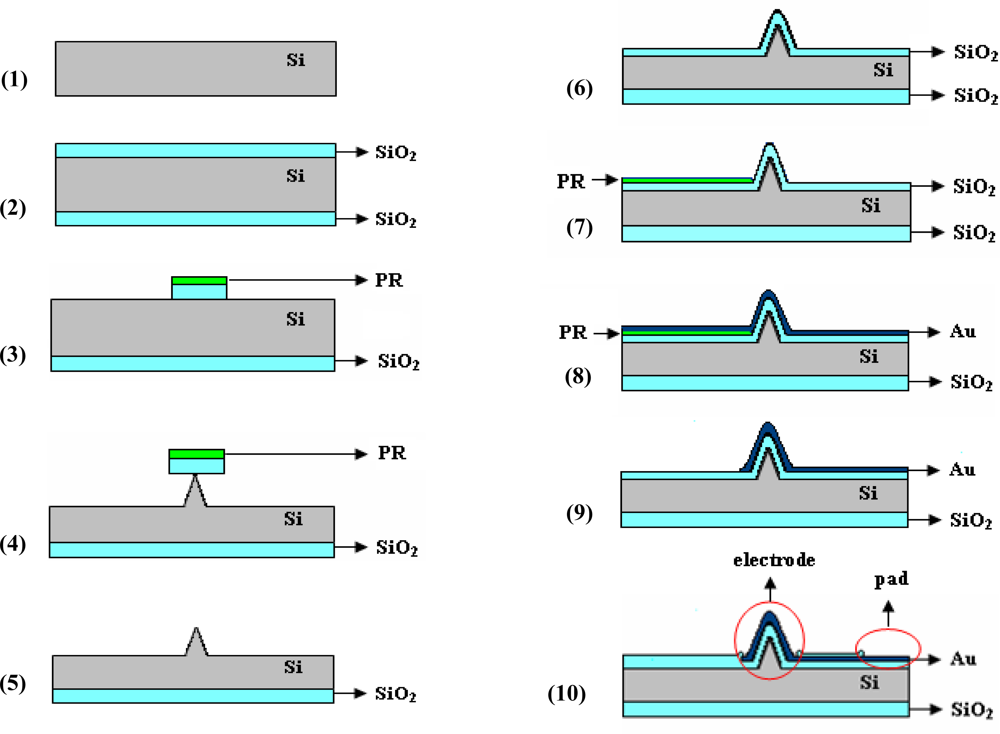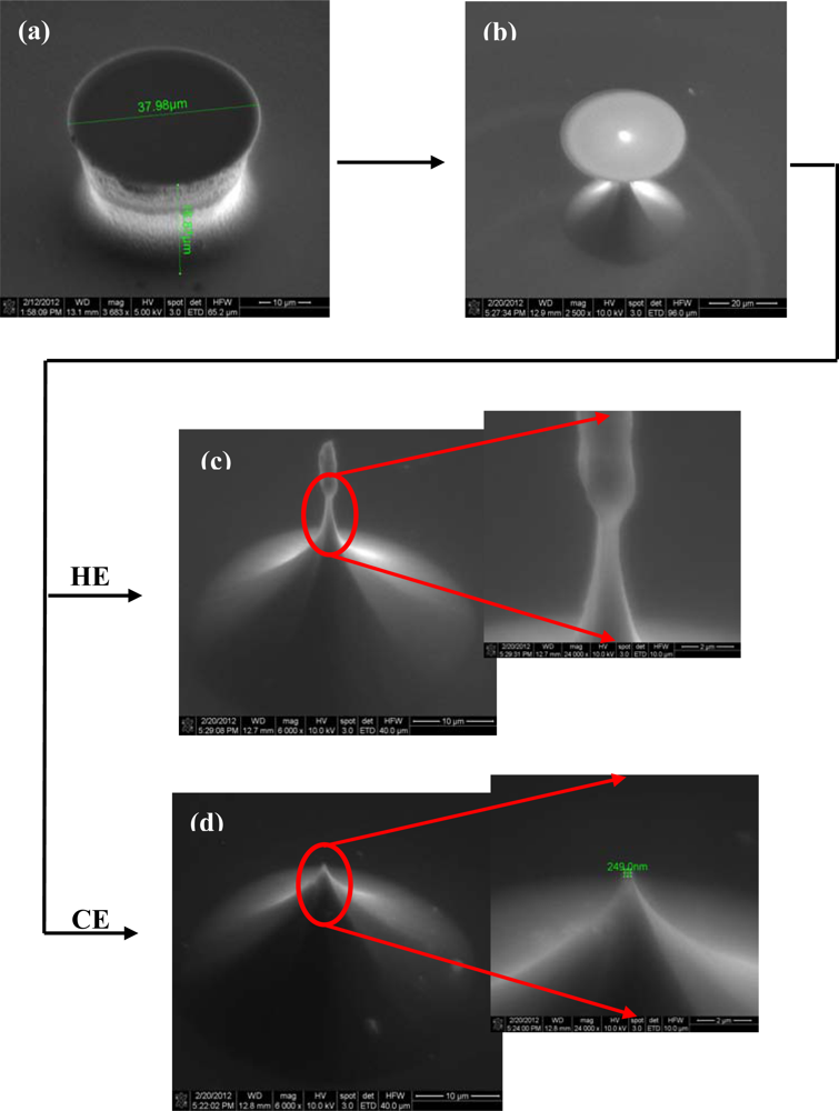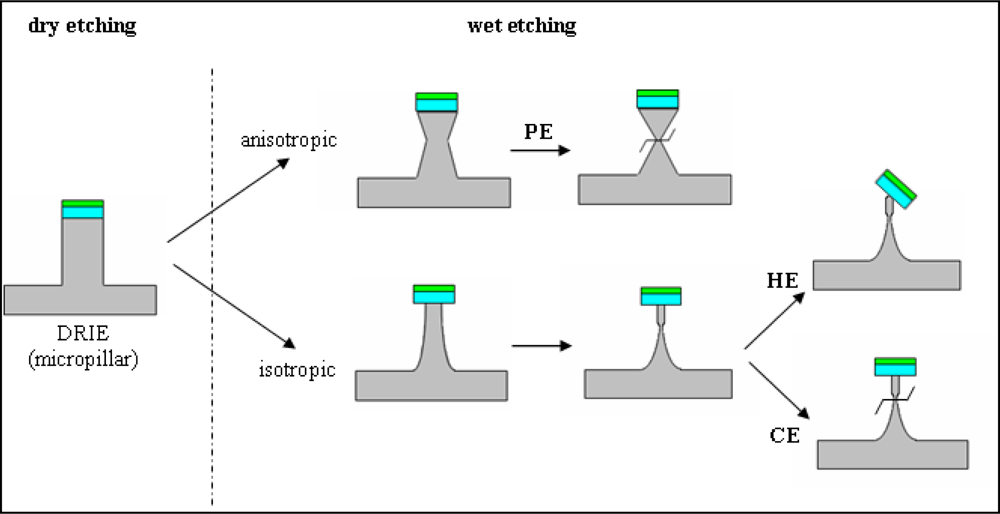 The structures have been regularly inspected during the etching, after each minute, to stop the process when the oxide caps (etch masks) remain hung up only by a small contact base, just before releasing (Figure 3(b)). There are two options identified at this point: (i) the first one is to apply a short ultrasonication treatment to remove the caps, obtaining high aspect ratio structures (and then high aspect ratio electrodes–HE); (ii) the second one is to continue the etching for few seconds, which results into further sharpening of the tips with consequent loss of height; however, they remain taller than the pyramidal structures (conical electrodes (CE)). Regarding the electrode apex tip diameters, they are around 150–250 nm for pyramidal (PE) and conical (CE) electrodes and 750–900 nm for the tallest ones (HE), respectively. Although the last type might not be as good in terms of penetrating tissue slices, its advantage is that, as well as the pyramidal terraced types, it is able to ‘automatically’ anchor the tissues [32]. Figure 4 presents schematically the evolution of 3D structures during different stages of the dry or wet etching processes.