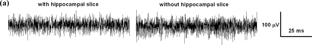 According to the selected pair of electrodes, their amplitude was generally correlated with the position of the recording electrode in relation to the average conduction path in the bath electrolytic solution between the stimulating and reference electrode. When a slice was present, we could elicit and record stimulus-triggered electrical activity.