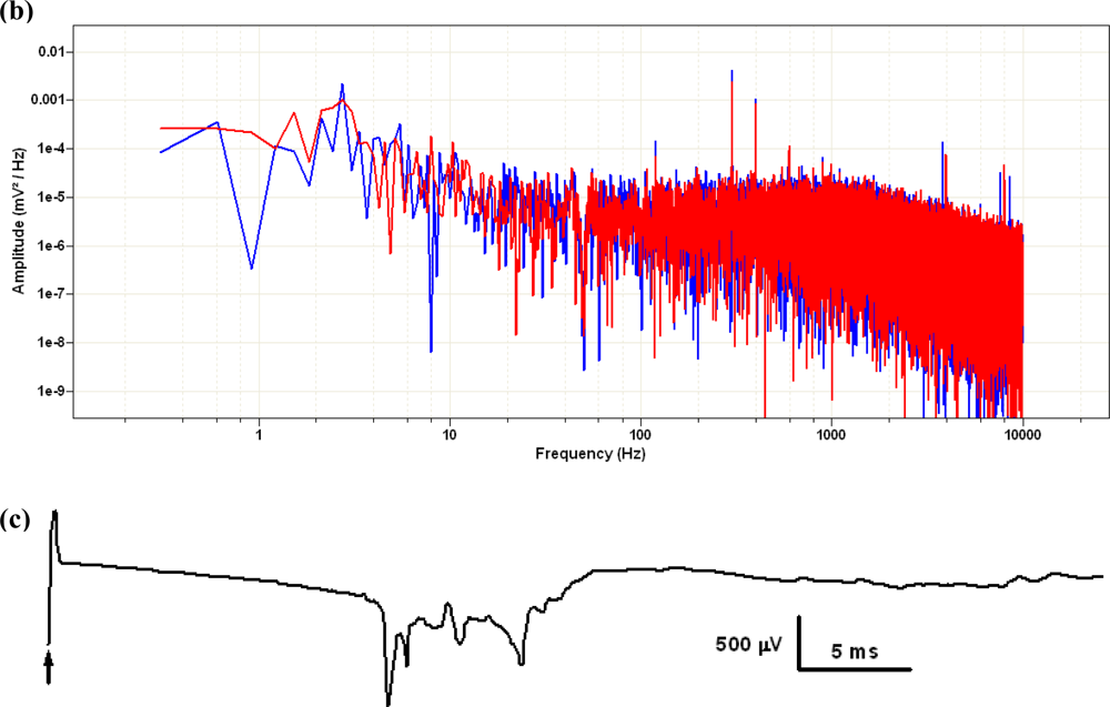 The electrical behavior of the MEA device during recordings was adequate. The noise level of the unfiltered signal sampled at 10 kHz did not exceed 100 μV peak-to-peak and could be further reduced by appropriate hardware or software filtering. In Figure 10 we represented two brief (100 ms) intervals of recording taken with or without the preparation in place, and the corresponding power spectra of longer (10 s) stretches of the same recordings obtained via Fourier transform in Clampfit10, after applying a 50-Hz electrical interference removal soft filtering. When stimuli were applied between pairs of electrodes in the absence of the biological preparation we could record passive artifacts containing both conduction signals and capacitive artifacts.