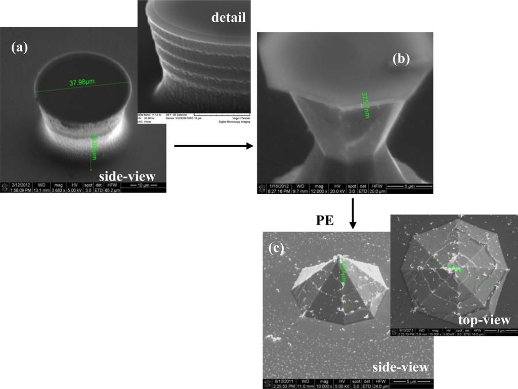 Both types of wet etchings aimed sharpening the micropillars, starting with the most common one, the anisotropic process in 30% KOH solutions (Figure 2(b)). Consequently, 3D octogonal base pyramidal structures, determined by the crystal site-specificity of the etching rates at the atomistic level, have been obtained for a 5 minutes etching at 70 °C temperature. As the images show, the process is relatively rapid, starts from both sides of the micropillars (top and bottom), and the pyramidal structure height, and consequently the pyramidal electrode (PE) height is at less than half of the initial pillar. In addition, the stairs observed after dry etching are preserved during the wet process, a significant detail for the further accommodation of biological material. Alternatively, the isotropic process in the high oxidizing solution: HNO3-CH3COOH-HF in the volume ratio 25:10:1 (V/V/V), respectively, leads to smooth and taller conical structures as presented in Figure 3.