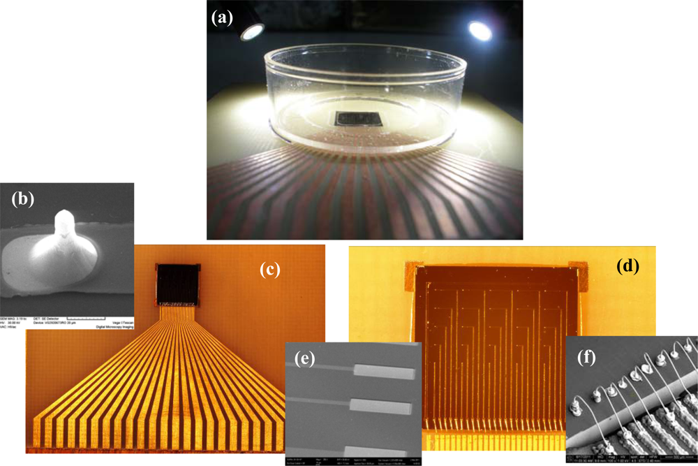 Further, mounted on gold-plated PCB connectors, they were included in custom-designed and built equipment in view of use within neuro-electrophysiology experiments on tissue slices or cultured cellular networks. Preliminary tests on acute newborn rat hippocampal slices yielded satisfactory results, similar to those previously reported using similar devices and types of experiments. Given the relative accessibility of silicon-processing technology and flexibility in design and manufacturing, we conclude that this class of MEA devices represents a promising development in several areas of fundamental and applied biomedical research.