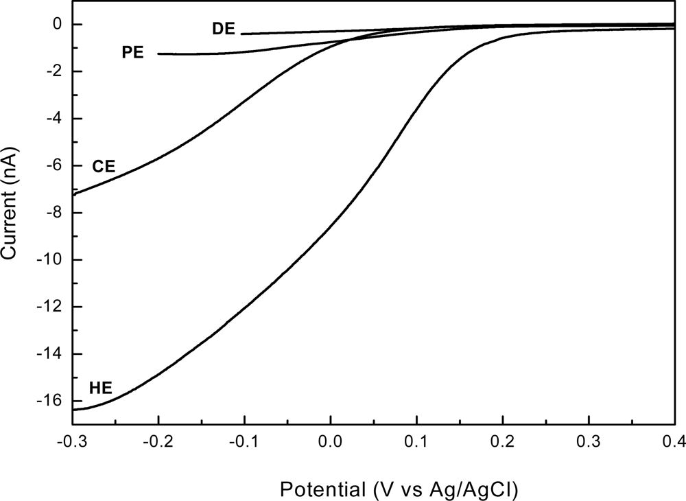 As shown in this figure, different sweeping ranges were adopted in our study: while for planar electrodes the diffusion-limited current was established around −0.1 V, by increasing the electrode area it reached more negative values, around −0.2 V, and finally extended to −0.3 V for CE and HE types. A plateau region extended over a large potential range indicates that the limiting current value is not affected by the mixed control region of the primary reaction and the current generated from the secondary reaction. This is the case of DE and PE. In some cases, however, the potential range of the plateau region is less than 0.2 V and a poorly defined plateau region may exists when both primary and secondary reactions occur at similar potentials or where the mixed control region extends close to the potential of the secondary reaction [33]—this may be the case of CE and HE. On the other hand, the linear steady state diffusion-limited currents are in good agreement with SEM images, a more than 40-fold increase in current being obtained by fabrication of a high aspect ratio 3D electrode (HE), which has the same base with those of planar disk electrodes (DE). Accordingly, the measured currents determined by each type of electrode are: 0.4 nA (DE), 1.25 nA (PE), 7.0 nA (CE) and 16.25 nA (HE), respectively, being a confirmation of the strong dependence of the magnitude of limiting currents on the electrode electroactive areas at a given concentration of ferricyanide.
