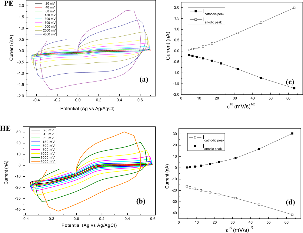 The voltammograms in Figure 7, showing a symmetrical sigmoidal response, are different when compared with classical peak-shaped ones, specific for macroelectrodes. In our case, the linearity of current vs. square root of scan rate translates a linear relationship typical for a diffusion-controlled process. For PE electrodes the correlation coefficient was 0.9991 for both anodic and cathodic sweeps, meanwhile the linearity was comprised between 80 and 4,000 mV/s. For HE electrodes the correlation coefficient was 0.9986 for the potential range of anodic sweep at cycling rates of 20–500 mV/s and 0.996 for the cathodic sweep at all rates (20–4,000 mV/s), respectively.