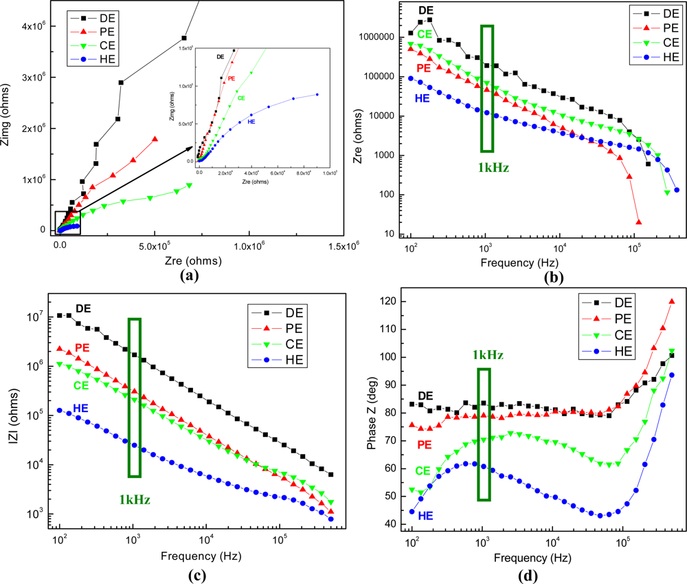The physico-chemical properties of the electrode-analyte interface have been further characterized by electrochemical impedance spectroscopy technique. The impedance responses of all fabricated types of gold plated electrodes at open circuit potential (OCP) are presented in Figure 8.
