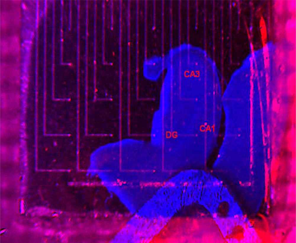 The 300-μm thick hippocampal slices did fit very well on the microelectrode array and could be arranged such that certain regions of interest (e.g., the dentate gyrus, CA3, CA1) were placed over specified electrodes. At the indicated superfusing solution flow rate the slices remained stable over longer time intervals, if properly fixed with the miniature metallic horseshoe. Figure 9 represents an artificially colored overlap image constructed in ImageJ from individual frames taken with the stereomicroscope camera before and after placement of the preparation, allowing precise identification of electrode positions relative to the slice anatomy and selection of an appropriate pair of electrodes for stimulation and recording.