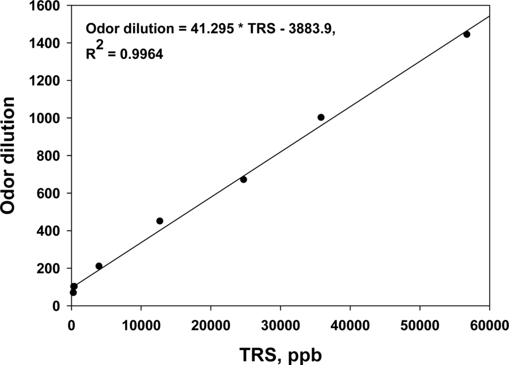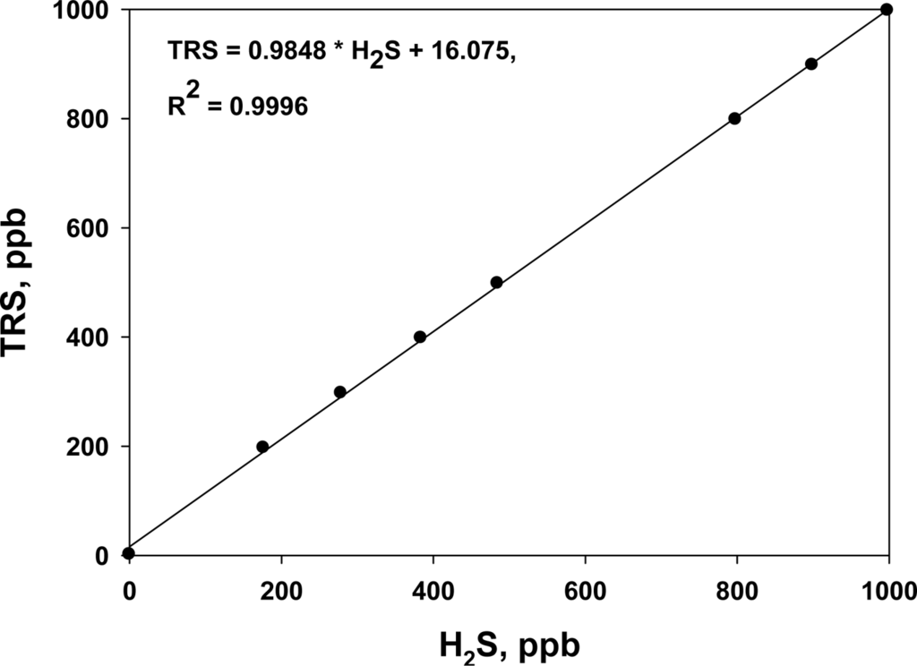 Before each on-line TRS analyzer was installed, it was calibrated with standard H2S gas. In addition, the instrument was regularly maintained to ensure accurate measurements. The R2 of the calibration curves was always higher than 0.9996 in the range 0 to 1,000 ppb (Figure 2). The TRS analyzers were operated for a week before and after the treatment at each site.