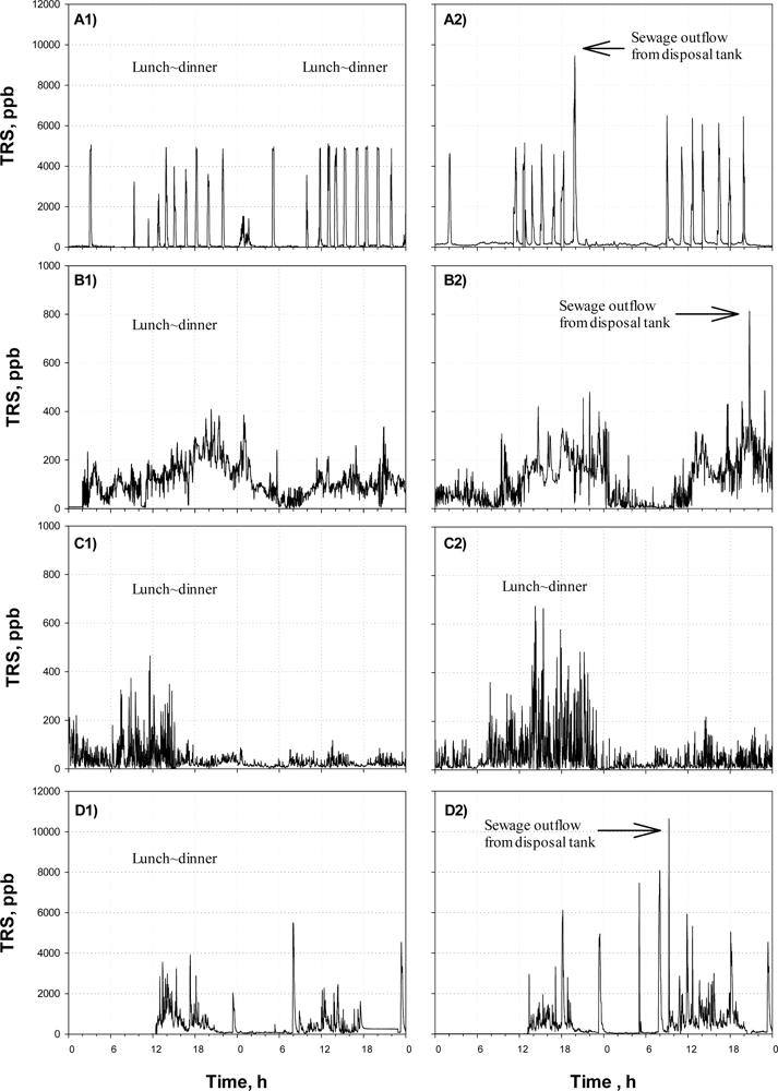 In general, the TRS concentration was high from the noon to the evening, with several intermittent high peaks (Figure 4(D)). In fact, the shops and jewelers in the district were open late in the morning at 9:00 to 11:00; so low TRS emission could be observed in the early morning. After the shops were closed after the evening, the TRS emission decreased below 100 ppb till the morning of the next day. The high TRS concentration peak observed at around 22–23 o’clock was found to be due to the pumping of wastewater from the septic tank into the sewer in a nearby building.