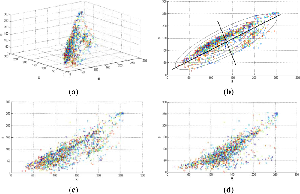 Figure 1, shows a random selection of 2,000 pixels in a typical grapevine image (RGB colour space). Note that, the variances in each direction (R, G, B) were different. This is the reason why it was necessary to implement a classifier that considered such differences, like Mahalanobis does. The region of constant Mahalanobis distance around the mean formed an ellipse in 2D space as in Figure 1(b).