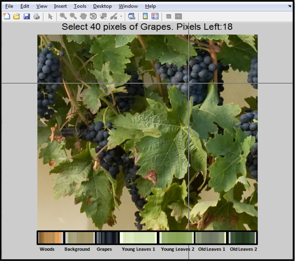 In the proposed methodology of this work seven reference groups of pixels were selected in order to generate the classification, in which every group represented a relevant characteristic of the grapevine canopy. The seven classes identified were: Young leaves (two classes), Old leaves (two classes), Wood (including shoots and trunk), Grapes and Background (or canopy gaps). However, if any of these classes was not present (depending on the growing stage), or a new class appeared on the image, the number and/or the group labels could be modified.