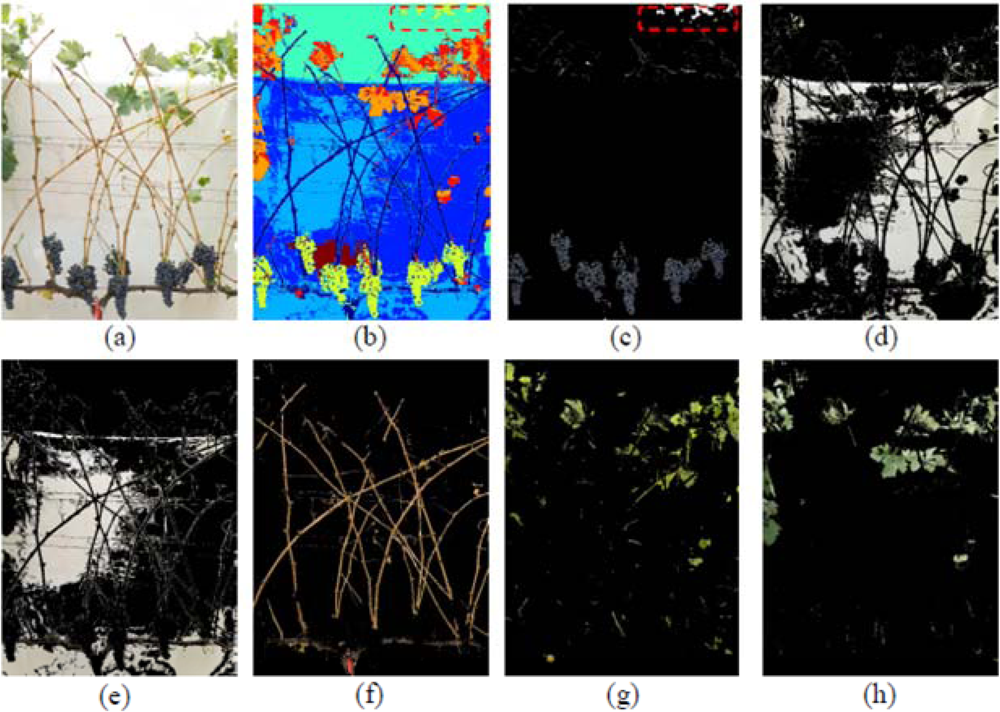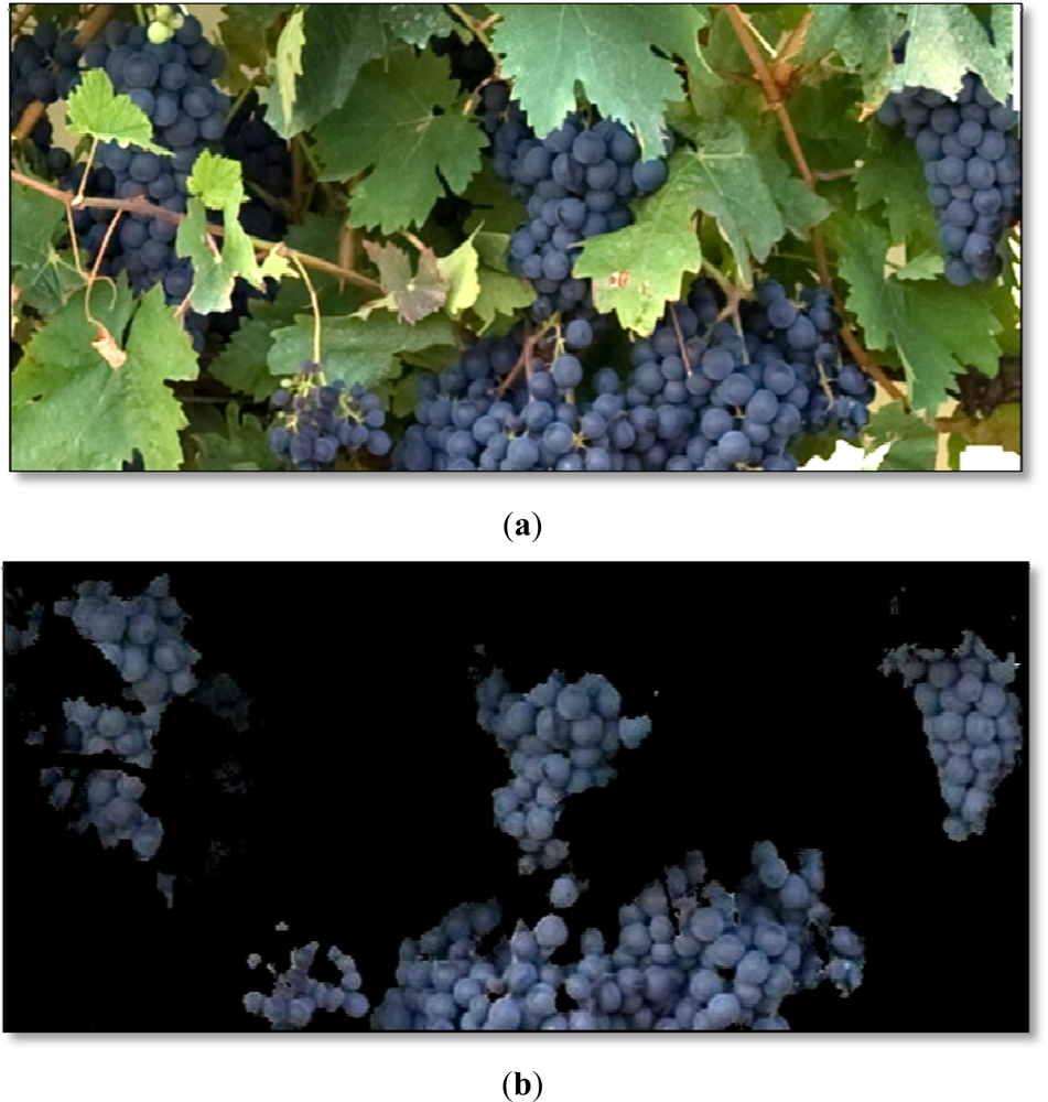 Colour classification techniques in the Red Green and Blue (RGB) colour space can be divided into supervised and unsupervised []. In supervised methods, the number of classes is specified and the supervisor selects the prototype of these classes. Conversely, in unsupervised methods, the characteristics of the classes are unknown, and the classification algorithm ascribes membership in such a way that the elements in each class will exhibit similar characteristics and are more similar to each other, than with respect to elements of other classes. Supervised and unsupervised methods have been used outdoors [] and specifically for vineyard feature extraction aiming at vigour characterization []; grape clusters and foliage []; single grapes []; count ‘fruit pixels’ for yield estimation [], or segregate grapes, leaves and shoots [,].