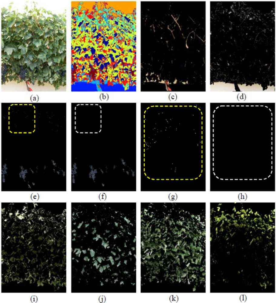 When the first defoliation step was performed (image I1), more clusters were exposed, the lighting conditions over the grapes improved, and consequently, their detection rate increased (Figure 6(a,b)). In Figure 6b, the Grape class appears in yellow, Wood class in dark blue, and the four classes of leaves (Young leaves grade 1, Young leaves grade 2, Old leaves grade 1, Old leaves grade 2), are presented in blue, light blue, cyan and red, respectively. When compared with the four Leaf classes shown in Figure 5, leaves in Figure 6 (classes (e) (f) (g) and (h)) were similar, showing that the classification algorithm was robust at segregating several foliar maturity stages when lighting conditions changed and defoliation was conducted.