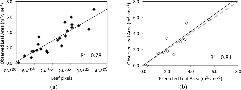 The images used in the present work corresponded to grapevines of medium to very dense canopies, in general, which seems to be the least favourable scenario for the estimation of leaf area by image analysis. However, the prediction of the leaf area from the model established by image analysis was very satisfactory, and it should be expected to perform better for grapevines with less dense canopies, as it is the case of low to moderate vigour vineyards.