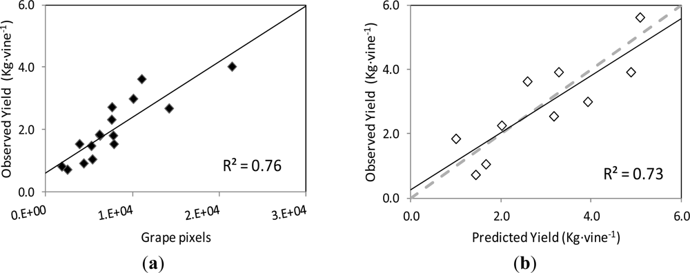 When this curve was employed to predict the yield of the images of the validation set, the correlation between the observed and predicted yield values was also close to the 1:1 line (y = 0.8907x + 0.253), with a R2 = 0.73 at p = 0.002, and RMSE = 0.749 kg (Figure 9(b)).