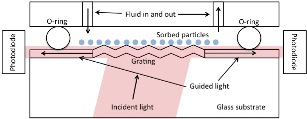 We used an OWLS 120 instrument (Microvacuum, Budapest, Hungary) to measure the mass density of ZTO coatings and pulsed laser deposition (PLD) derived CdSe quantum dots on waveguide surfaces. OWLS is described in detail elsewhere [11,15]. In brief, plane-polarized 633 nm laser light is coupled into a waveguide of approximately 200 nm thickness (range reported by the manufacturer, is 170 to 220 nm) by means of a grating embossed on the waveguide. Under conditions of total internal reflection within the waveguide, light can only traverse the waveguide and be detected if constructive interference occurs. Angles of constructive interference are sensitive to the effective refractive index (N) of the waveguide according to N = nsinα + lλ/Λ where n is the refractive index of air (or other covering medium), λ is the laser wavelength (633 nm), Λ is the grating constant (417 nm for our waveguides), and l is the diffraction order. N depends on the mass of sorbed molecules or material in a coating layer. Figure 1 shows the basic physical configuration of OWLS.