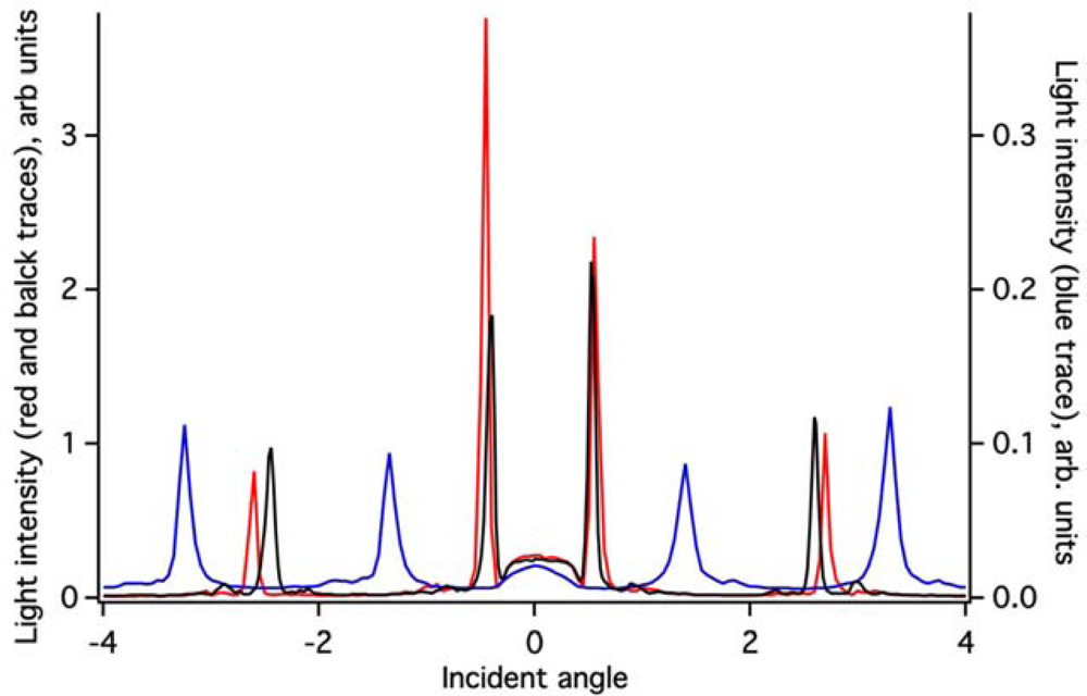 The ZTO coating on the (Si,Ti)O2 waveguide surface greatly attenuates the intensity of light detected in the OWLS spectrum (Figure 3). Because the ZTO has a higher refractive index than the underlying waveguide, light that reaches the ZTO-waveguide interface refracts into the ZTO. Light can then undergo TIR at the ZTO-solution interface and re-enter the waveguide. However, much of the light that enters the ZTO is evidently scattered out of the ZTO and never re-enters the waveguide, resulting in signal attenuation. However, as Figure 3 shows, the ZTO-coated waveguide OWLS spectrum still exhibits clear peaks at precise angles. These are used to determine sorbed mass. As long as the peak position can be determined, peak height does not matter. Note that in Figure 3, the peaks in the spectrum for the ZTO-coated waveguide occur at very different angles compared to the original uncoated waveguide. This is a direct consequence of deposition of the ZTO layer and its effect upon the effective refractive index of the waveguide sensor.