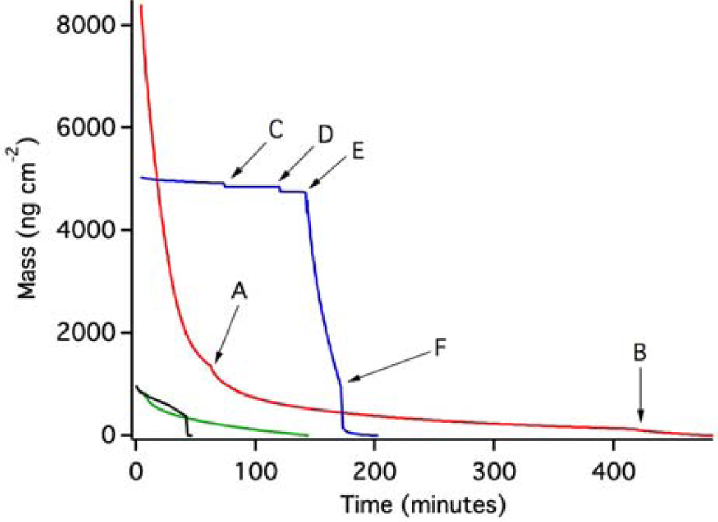 These results require some discussion. First, the dissolution of ZTO is so slow that mass loss could not possibly have been caused by dissolution. This, and the differences between experiments in Figure 4, led us to conclude that the ZTO coating was being removed from the surface without dissolving. The ZTO coatings were all made using the same procedure, but this does not preclude variations in the thickness, cohesion, and properties of the coating. The physical treatment of the coated waveguide is probably important as well. Manual injection of fluids into the OWLS fluid cell can result in different fluid flow velocities during different injections, leading to differences in the subsequent cohesion of the coating. In addition, the surface tension forces of air-water interfaces could readily disrupt a poorly cohesive coating if bubbles are pushed through the fluid cell.