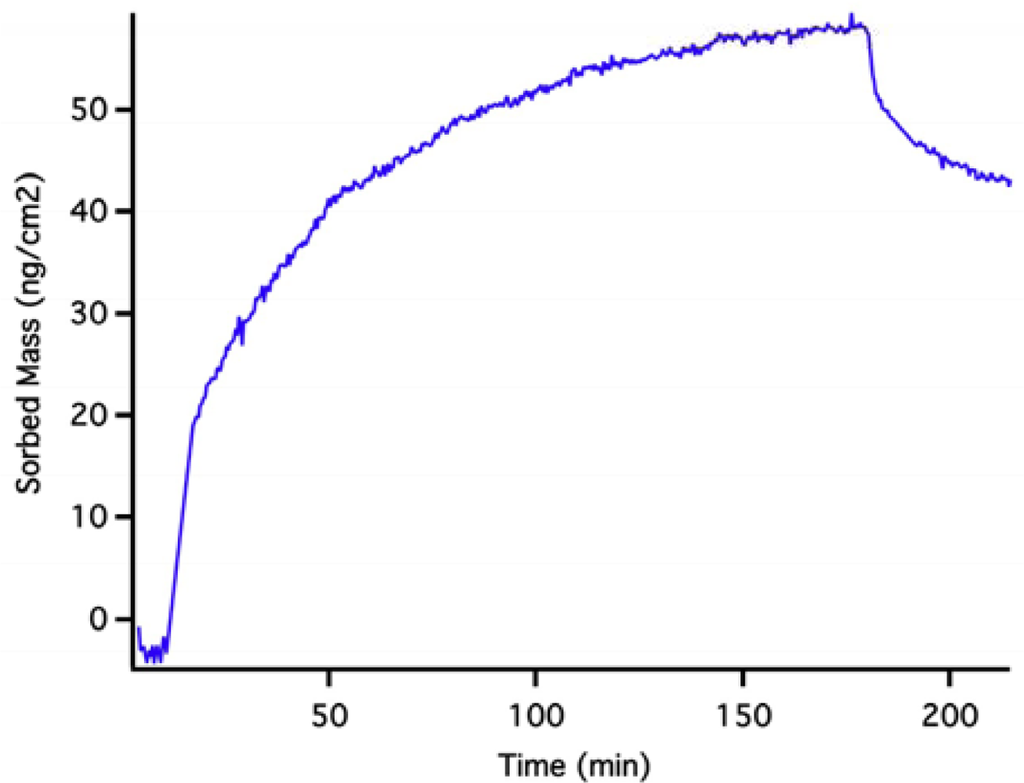 In OWLS, it is usually necessary to achieve a stable baseline in a particle-free buffer solution before introducing buffer solution containing particles (or, more typically, proteins). Sorption is monitored until a satisfactory data set is recorded, and then particle-free solvent is reintroduced and desorption is monitored. Because OWLS depends on refractive index contrast between particle-free and particle-containing solvent, the measured adsorbed mass includes the mass of particles but not that of the solvent between the sorbed particles. Determination of sorbed mass in OWLS requires knowledge of dn/dc, the change in refractive index of a solution with a change in mass concentration of the sorbing solute. We measured this quantity, and also calculated it for our different solutions based on the refractive index of suspended particles mixed with the refractive index of water in proportion to concentration. We found that this quantity was nearly identical to that typically used for proteins and that it therefore had negligible effects on our results compared to other uncertainties.