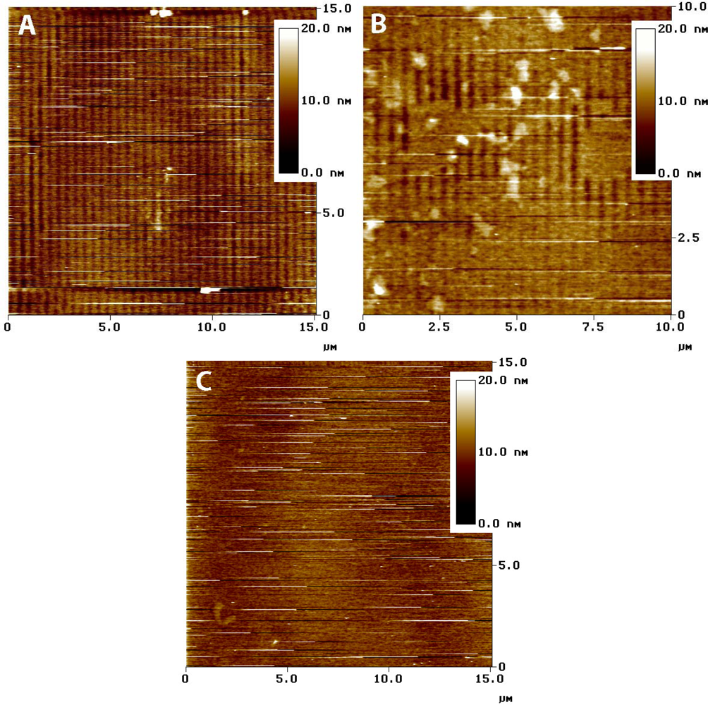 Contact-mode AFM imaging of fresh ZTO-coated waveguide surfaces resulted in physical removal of the ZTO material (data not shown), a result consistent with weak adhesion of the film to the waveguide substrate. Tapping mode AFM imaging was relatively stable (Figure 6) but the frequent streaks in the images are the result of dislodged particles interfering with tip motion. Figure 6(A) shows the waveguide surface near the middle of the fluid covered area. The waveguide grating is readily visible, indicating that the covering ZTO layer has mostly been lost. Figure 6(C) shows the waveguide near the edge of the fluid-covered area; patches of ZTO-covered area occur along with uncovered areas showing the waveguide diffraction grating. Larger aggregate particles are also visible, which we speculate result from aggregation of smaller fundamental ZTO particles during mobilization of the particle layer by fluid flow. Only in the area not exposed to solution (Figure 6(C)) is the ZTO layer intact, though with frequent streaking indicating that ZTO particles are easily dislodged from the layer. The AFM results confirm the OWLS observation that ZTO was removed from the waveguide surface upon injection of the QD-containing solution.
