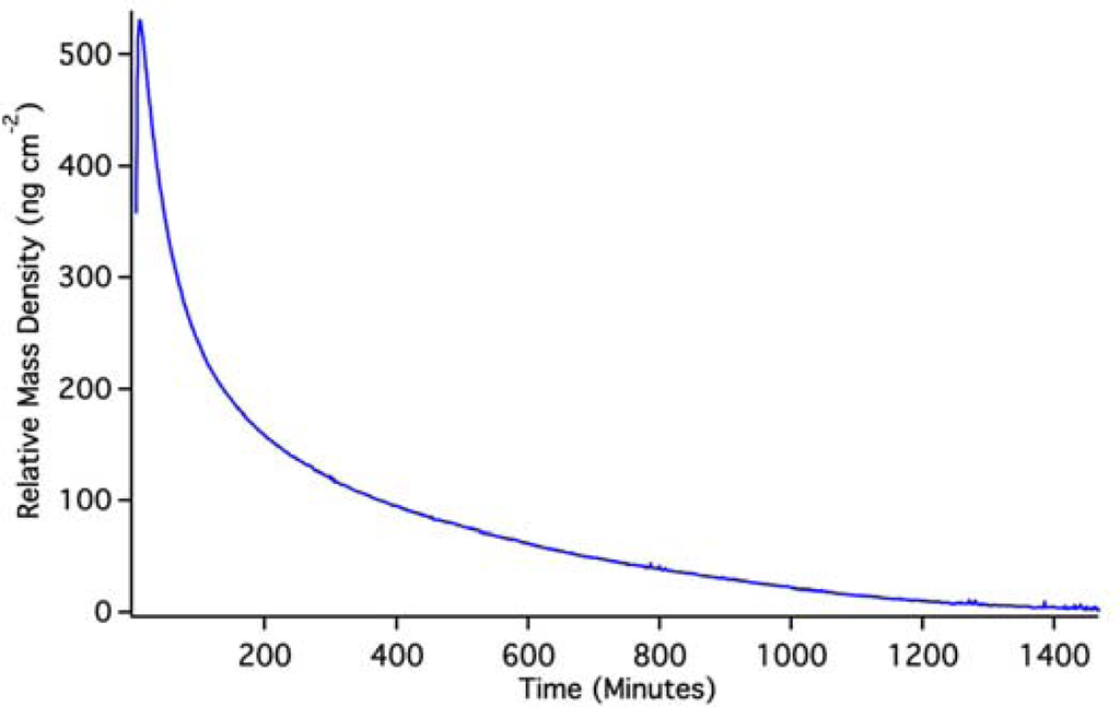 The initial rise in mass is the result of the solution initiating an approach to a baseline that can be predicted by exponential extrapolation to occur at about 640 ng·cm−2. The OWLS signal then reaches a peak and descends due to dissolution of PLS QDs in the pH 2 solution. Back-extrapolation of this mass loss using a double-exponential fit indicates an original starting mass density of 620 ng·cm−2, in good agreement with extrapolation of the initial rise. This suggests that, over the course of the experiment, we have dissolved the equivalent of 630 ± 10 ng·cm−2 quantum dots from the waveguide surface. A full monolayer of hexagonally close packed 5 nm quantum dots would have a mass coverage of about 3,500 ng·cm−2, so the PLD QD density must be about 18% of a full monolayer assuming complete dissolution. We are confident that the mass loss signal in this case stems from dissolution because it is known that un-capped quantum dots dissolve on this time scale [19] (which extends for 1 day).