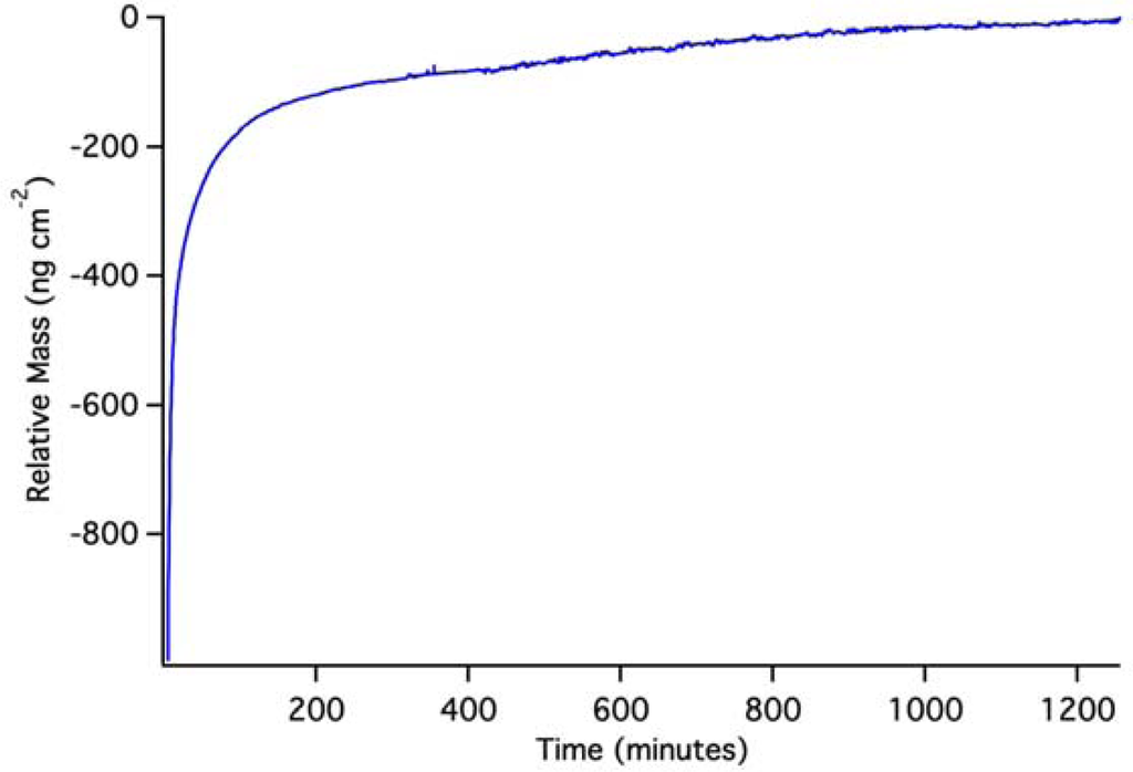 It is important to remember that the choice of baseline in OWLS is arbitrary, based usually upon time-invariant data for which it is known that no particles or proteins have yet sorbed to the surface. OWLS observations are then interpreted in terms of mass gain upon introduction of particles or proteins to the solution and their subsequent sorption to the surface. The choice of baseline does not affect the absolute mass change measurement, merely the zero point. Baseline only has significance as a point of known mass coverage against which to compare changes. In this study, the only way to obtain a baseline for the annealed waveguide after ZTO film deposition, assuming that the annealing step (see Section 2.2) changes the original waveguide properties, is to use post-experiment time-invariant data. In addition, we can independently confirm mass-loss using AFM observations of the film.