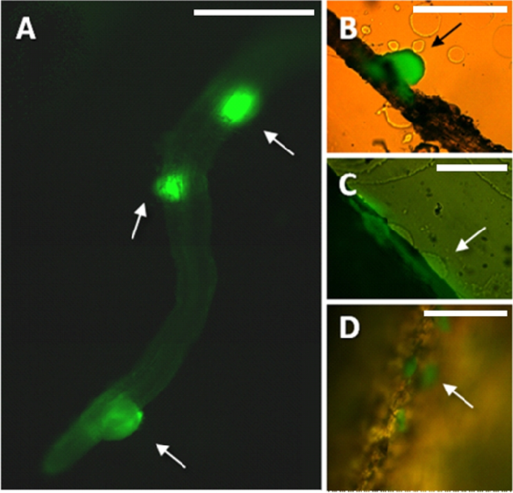 Preparation of samples for microscopic analysis involved embedding of the harvested roots in a specially formulated enrichment medium. Enrichment was already proved useful for showing bacterial infection of plant tissue [29]. In this study, the composition of the medium enabled in situ growth of mini-colonies of the studied PGPR candidate while inhibiting the growth of most other microorganisms. The samples were not removed from the embedding matrix for microscopic observation, in this way enabling preservation of the original colonization sites. Enrichment approach applied in this study enables fast screening for bacterial colonization sites along the roots even in case of sparse target microbial populations. It is important as certain strains can prefer to colonize different segments along the root (i.e., the root base or the root tip) [30]. Using this method, in combination with fluorescence microscopy, we have found that the small population of MB73/2 on potato root is non-uniformly distributed: neighboring colonization sites could be observed (Figure 1(A)) as well as large unoccupied areas. M73/2 GFP cells were detected both in the root maturation zone and at the root base. Interestingly, the cells were more abundant on the stolon and the peel of immature progeny tubers than they were on the root (Figure 1(B,C)).