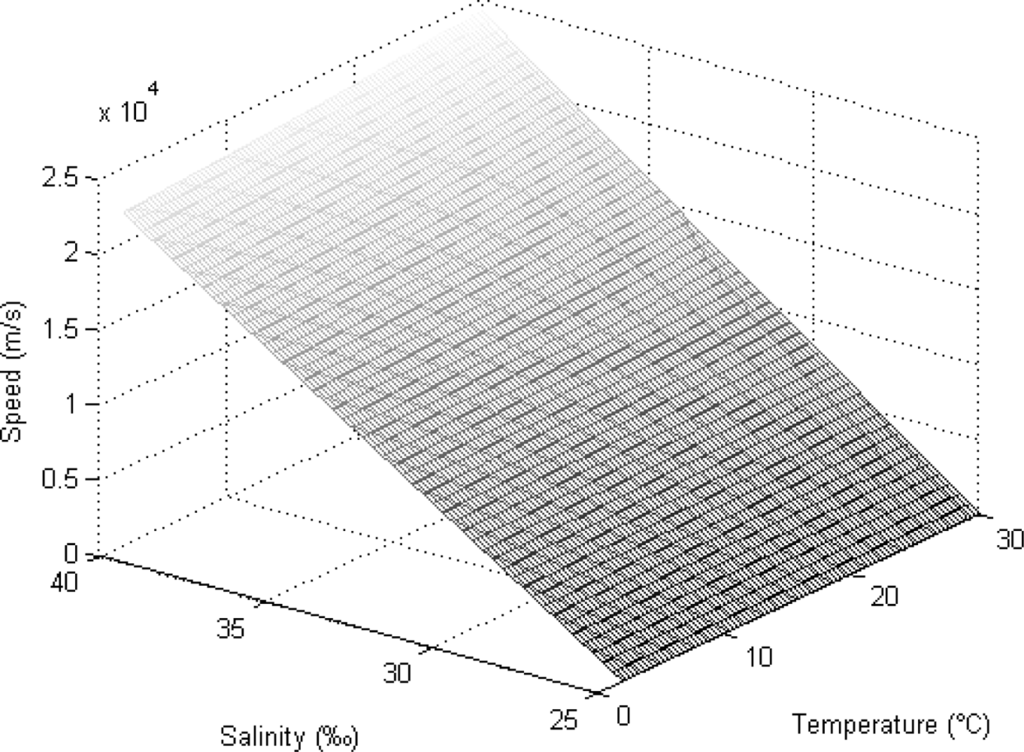 Here, T, S, and D refer to the temperature in degrees Celsius, the salinity in parts per thousand, and the depth in meters respectively. This equation is valid within the temperature range from 2 to 30 °C, 25 to 40 parts per thousand (‰) salinity and depths from 0 to 8,000 m. Figure 1 shows the change in the speed of the acoustic signal with the temperature and the salinity if the depth is fixed at 50 m. When the temperature of seawater increases, the speed of the acoustic signal also increases steadily. The speed shows a dramatic increase if the salinity increases. The effect of the salinity is higher than that of the temperature.