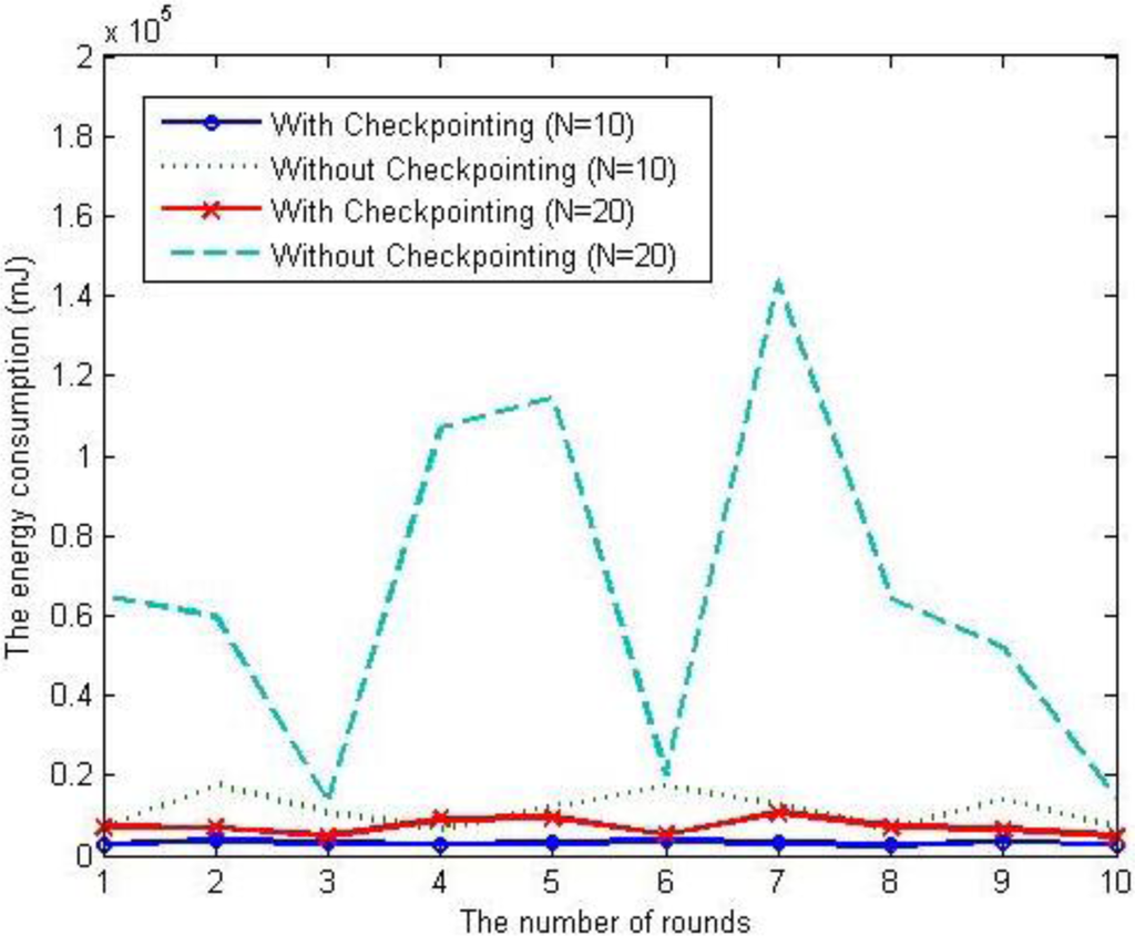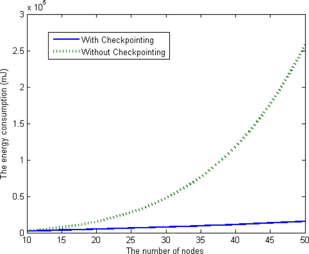 We simulated two schemes using MATLAB [25],a well-known simulator for verifying numerical models. We implemented our checkpointing scheme based on a clustering-based routing protocol. As shown in Figure 10, when the number of member nodes in a cluster increases in a range from 10 to 50, the average energy consumption of our checkpointing scheme is less than that of the previous scheme (without checkpointing). Our scheme is also superior to the previous scheme in terms of scalability, as the energy consumption of the proposed scheme steadily increases with the number of nodes in a cluster.