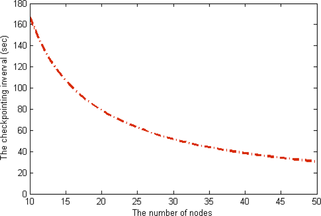 The energy consumption of the scheme without checkpointing is higher than that of our scheme, and the difference between the two schemes steadily increases as the number of nodes in a cluster increases. With this extra energy, our scheme reduces the checkpointing interval and increases the reliability of the underwater sensor network. In this case, we derived optimal checkpointing intervals of between about 160 s and about 30 s when the number of sensor nodes ranged from 10 to 50 in Figure 11. The results show that as the number of sensor nodes increase, the amount of extra energy (Epre – Eckpt) increases, as does the amount of checkpointing messages. In summary, the optimal checkpointing interval approaches 20 s as the number of sensor nodes in a cluster increases.
