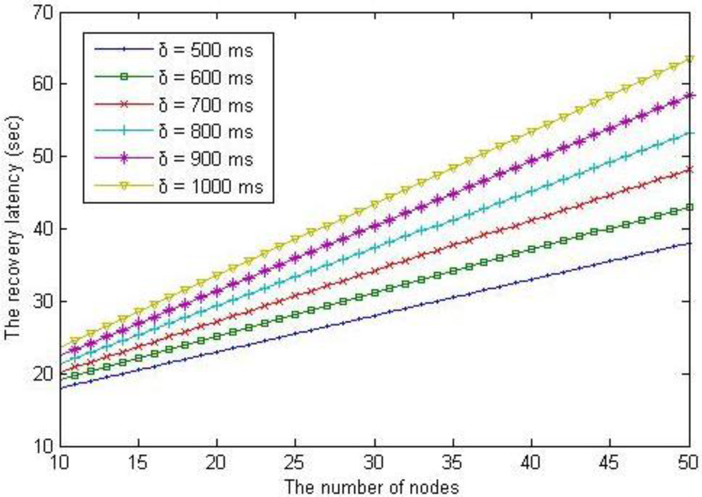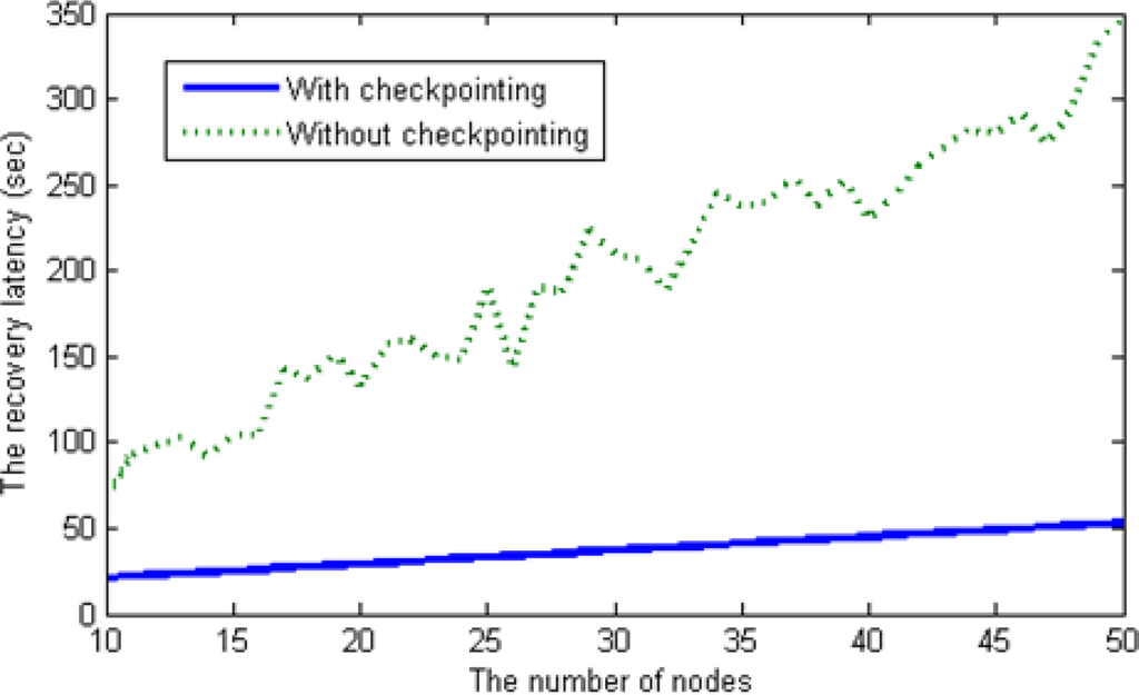 To compare the recovery latency between the scheme with checkpointing and that without check-pointing, we deployed sensor nodes randomly, meaning that we assigned the distance between a head node and each member node (ranging from 1 to 15 km) arbitrarily. The recovery latency is affected by the number of messages sent during the recovery process. In the scheme without checkpointing, O(n2) messages are generated during the re-election process as the number of nodes increases in a cluster. However, our checkpointing scheme when applied generates only O(n)messages via the backup node; thus, the recovery latency with checkpointing increases linearly, as shown in Figure 13.