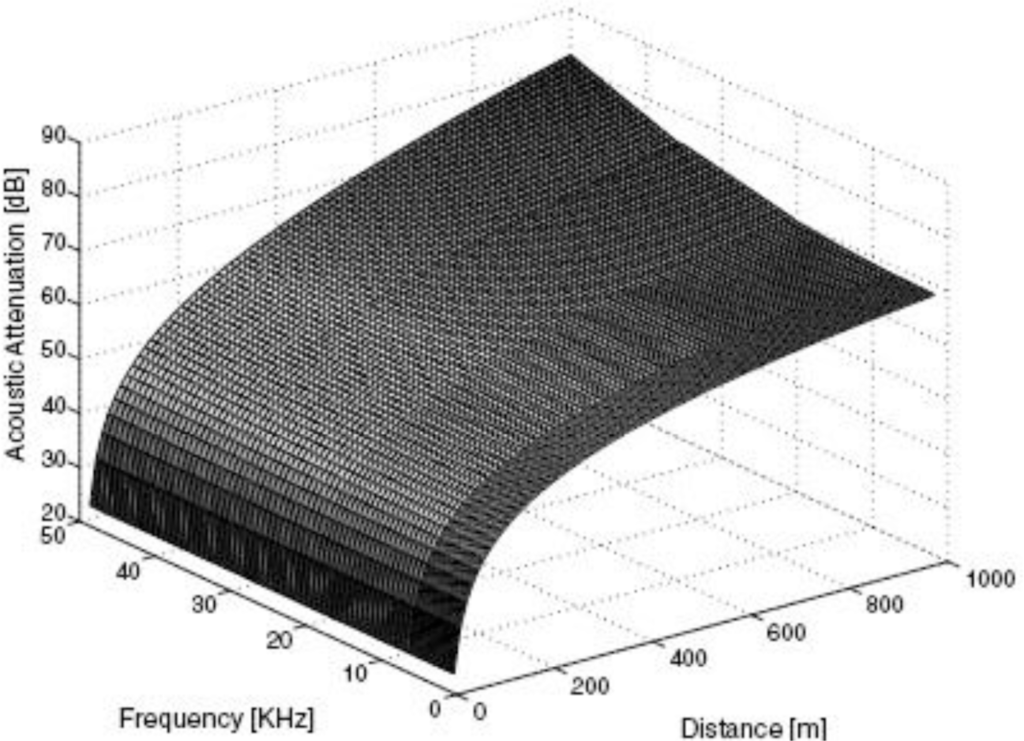 Here, d is the distance (m), f is the frequency (kHz) and α(f) is the absorption coefficient (dB/km) Figure 2 shows a graph of this attenuation with the distance and the communication frequency. In UWSNs, the available bandwidth (under 50 kHz) is severely limited due to the extreme characteristics of the underwater channel. As the distance increases, the attenuation also increases rapidly.