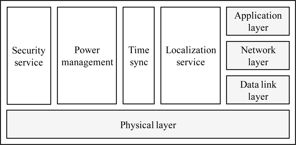 The security service protects the underwater sensor nodes and their communications. The power management plane is responsible for the network functionalities aimed at minimizing the energy consumption. The time synchronization service adjusts the local time of each sensor nodes to the global time. The localization service is responsible for providing absolute or relative localization information to the underwater sensor node, when needed by the protocol stack or by the application.