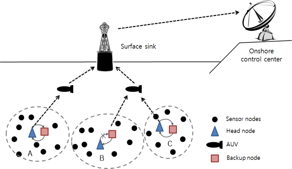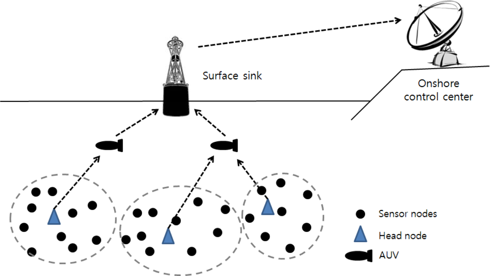 An autonomous underwater vehicle (AUV) is a vehicle which travels underwater without requiring commands from an operator. AUVs include sensors to prevent collisions, propulsion devices to move them forward, and batteries to supply power. They collect data from head nodes as they travel among head nodes. A surface sink node is attached onto a floating buoy with satellite or RF capabilities to transmit data to an onshore control center. It aggregates data sent from head nodes by using the acoustic signal. To reduce propagation delay, the surface sink connects to the acoustic modem by wire near the bottom of the ocean. The onshore control center manages and monitors the entire network.