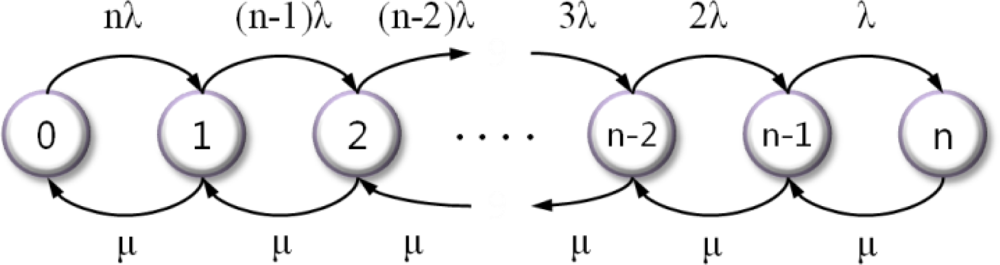 In [21], there is a special case of the birth-death process that involves the use of continuous-time Markov model. Figure 7 shows the state diagram of our model, where the state refers the number of failure nodes.