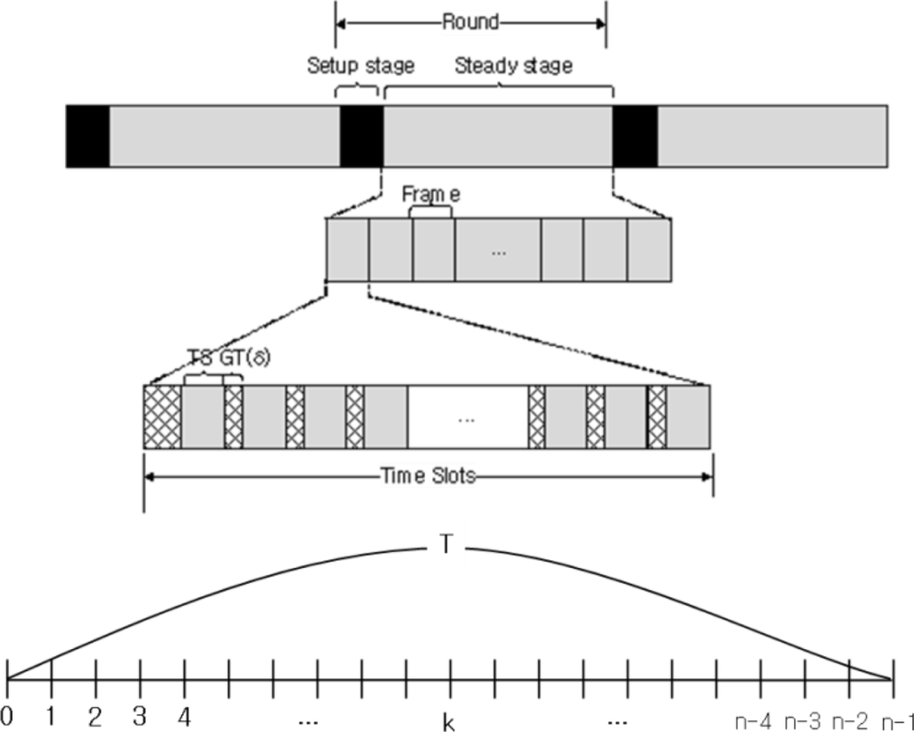 Figure 8 shows the time line of the clustering protocols that use TDMA-based scheduling. Each round is composed of a setup stage and a steady stage. All clusters are formed during the setup stage, and data transmission occurs during the steady stage. A steady stage comprises several frames, and each frame is divided into time slots that are assigned to each member node so as to send data to a head node without communication interference. There is some guard time (GT: δ) in order to avoid acoustic collisions at the head node when two member nodes using adjacent time slots send their data message [22]. In this scheme, the head node can calculate the delay and distance to each member node through the time-of-arrival approach that measures the round-trip time of an acoustic signal between the head node and a member node [19].