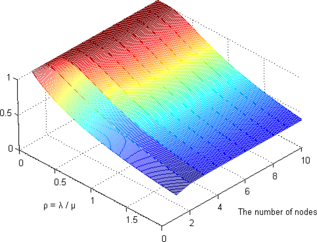 Figure 9 shows the steady-state availability of our scheme via the number of backup nodes where ρ (λ/μ) is Equation (6). If the rate of the watchdog timer is higher than the failure rate (ρ < 1), the reliability of our system is greater than 80% when using three backup nodes. If the repair rate is identical to the failure rate (ρ = 1), our system maintains a reasonable level of availability (more than 73%) using just three backup nodes. Therefore, we determined the minimum number of backup nodes as 3.
