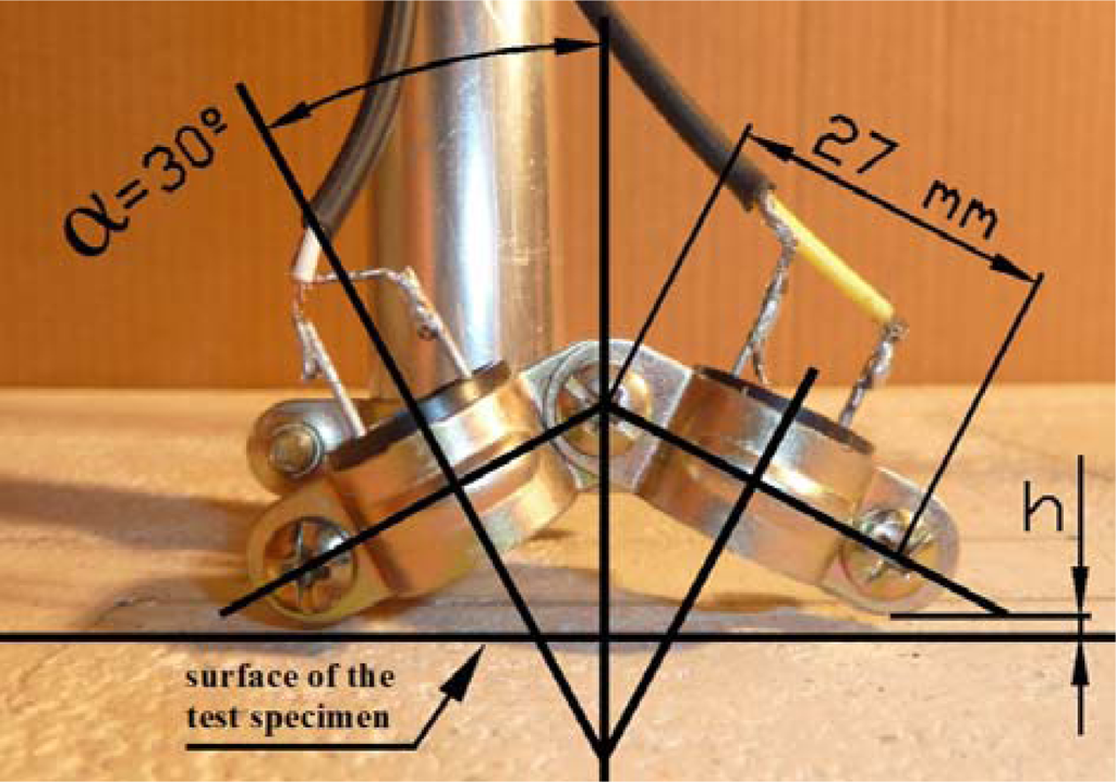 In addition, we tested another sensor configuration in terms of their orientation. The emission was perpendicular to the test specimen surface and two symmetrical receivers forming an angle to the test specimen were used. However, the results obtained with this configuration did not provide clear information about the position where the bricks are located.