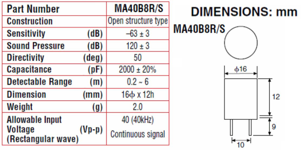 A 40 kHz Murata Manufactoring Co., Ltd (Kyoto, Japan) ultrasonic MA40B8S emitter and a MA40B8R receiver were used. The emitter was driven constantly by a 1.5 volt peak to peak sinusoidal wave. As already mentioned, each of them was mounted forming a 30° angle with the perpendicular axis of the test specimen under study (Figure 1). The transducers cover a bandwidth ranging approximately from 38 kHz to 43 kHz and are 1.6 cm in diameter (Figure 2).